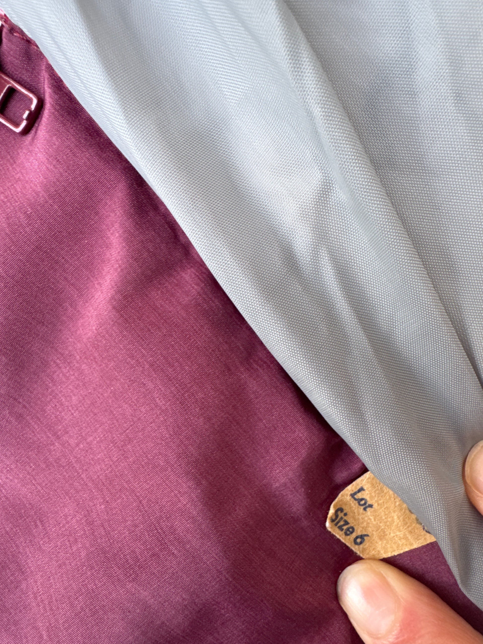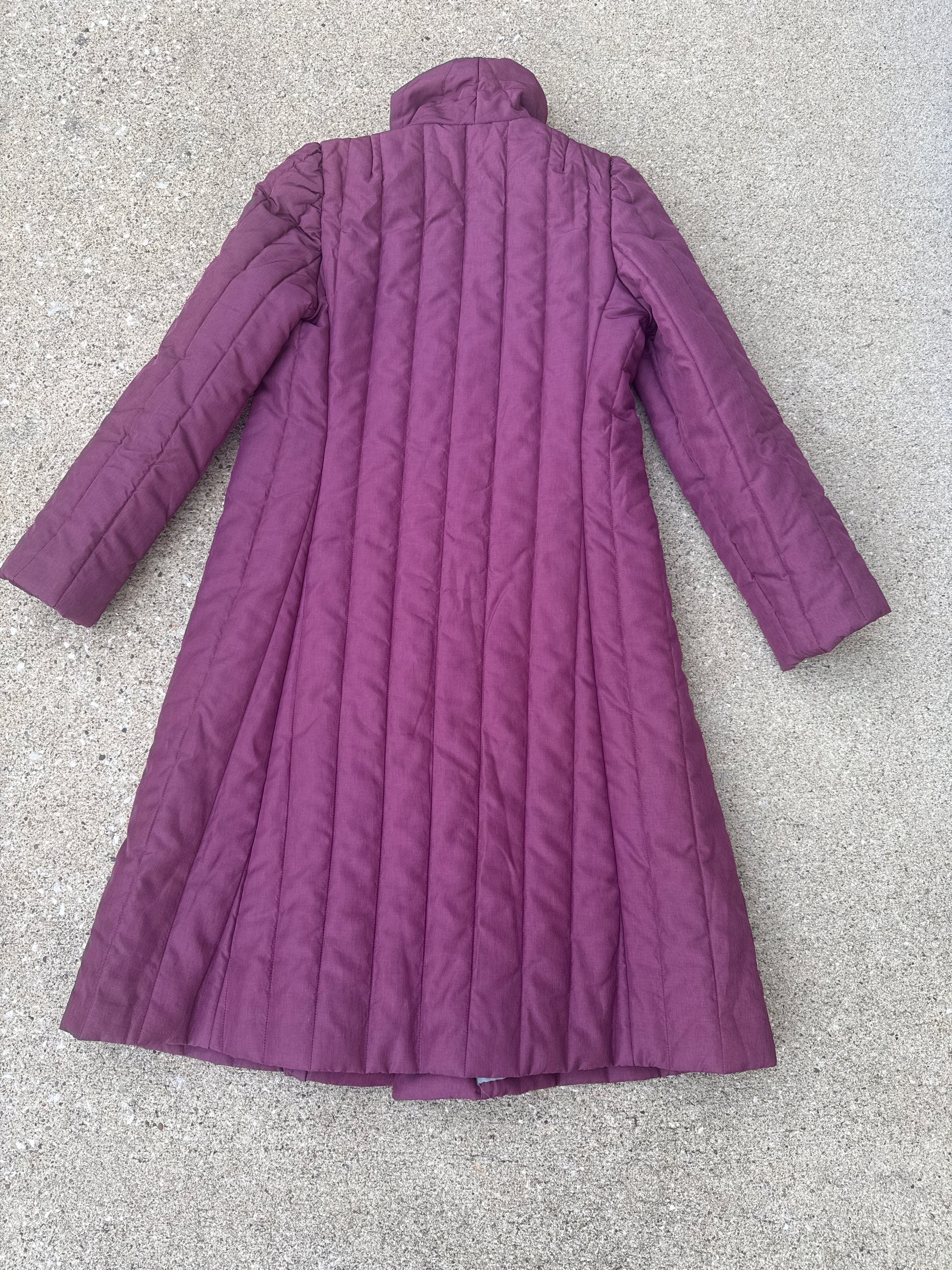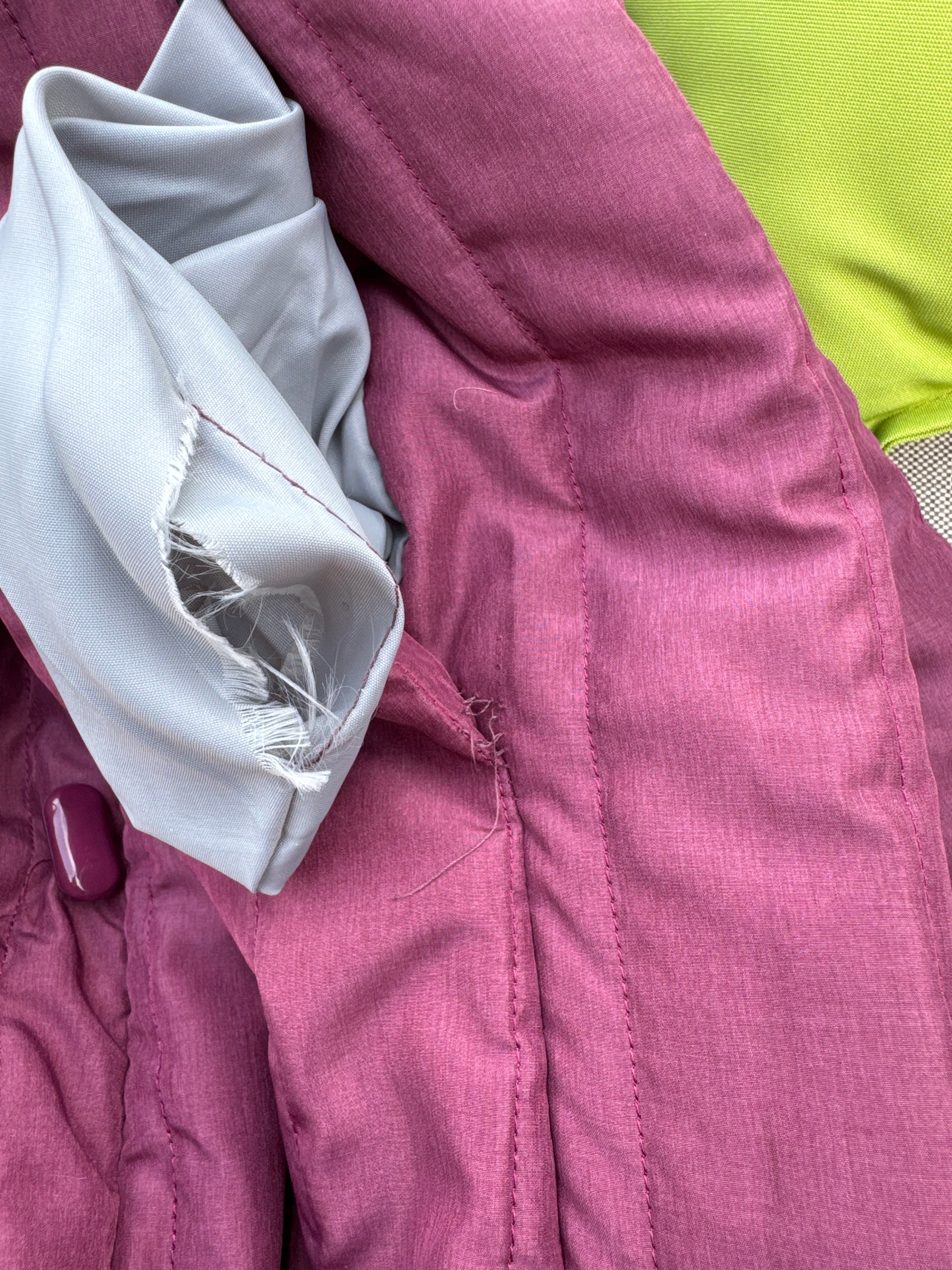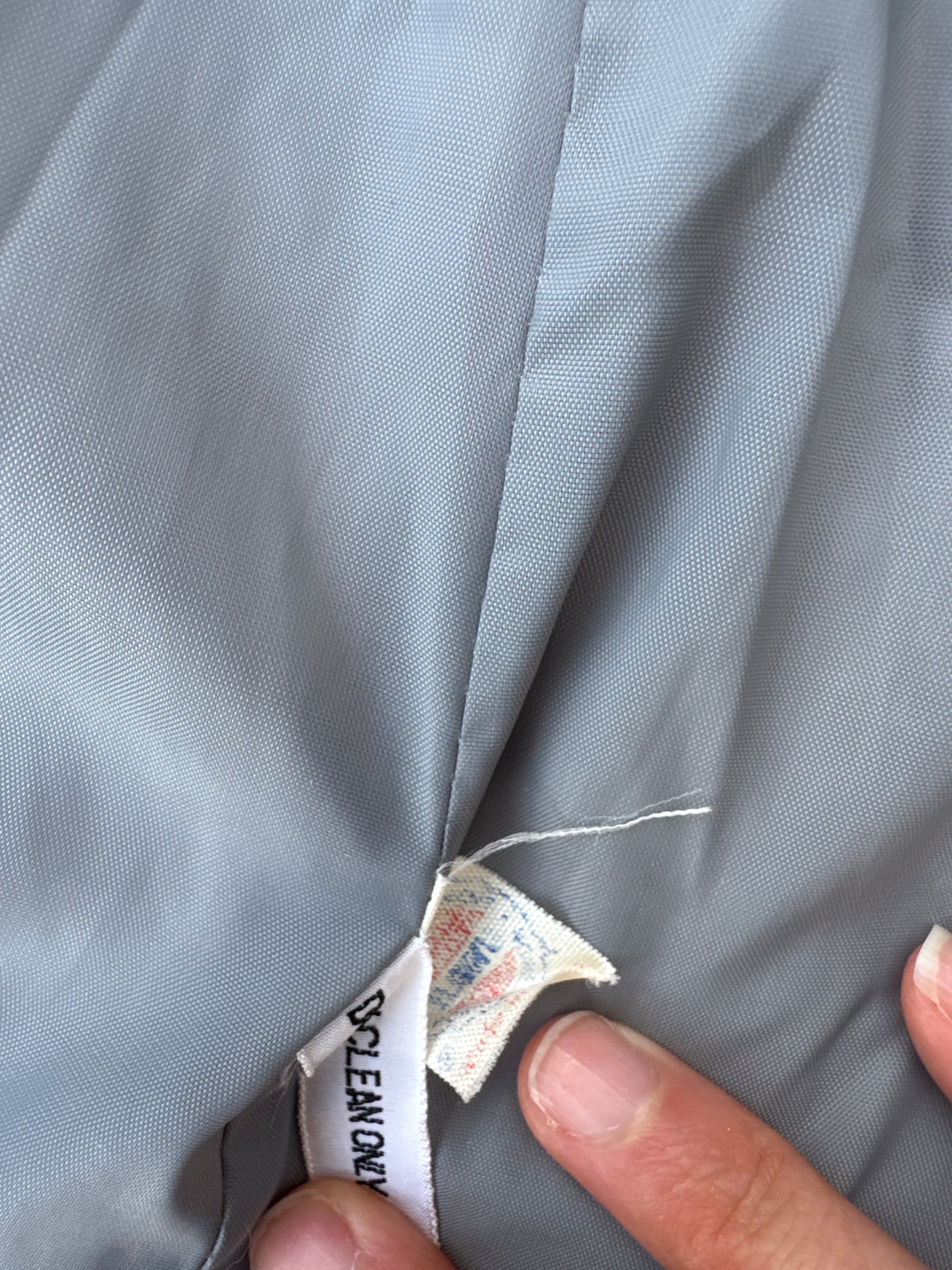 A few small spots on front of coat. One pocket has a hole in inner lining. Pocket seam coming apart a little at pocket openings. A little wear on inner collar.