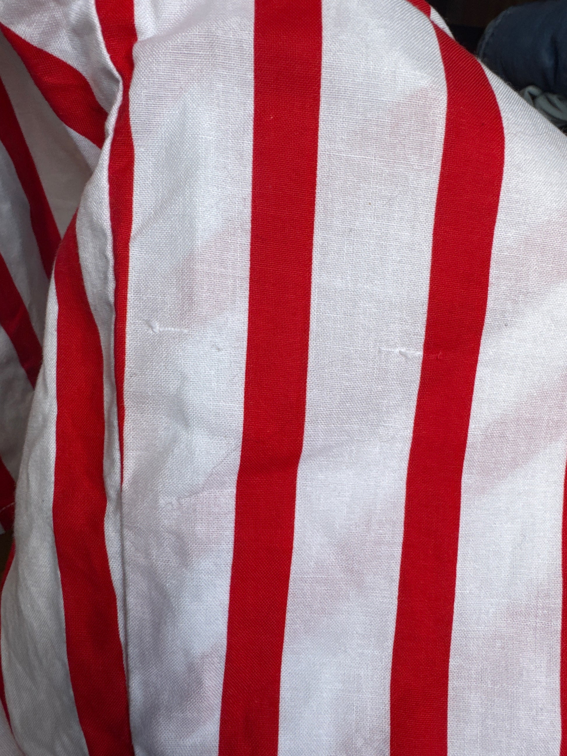 removable shoulder pads. Open front. Very minor yellowing of white striping. Small snag on back