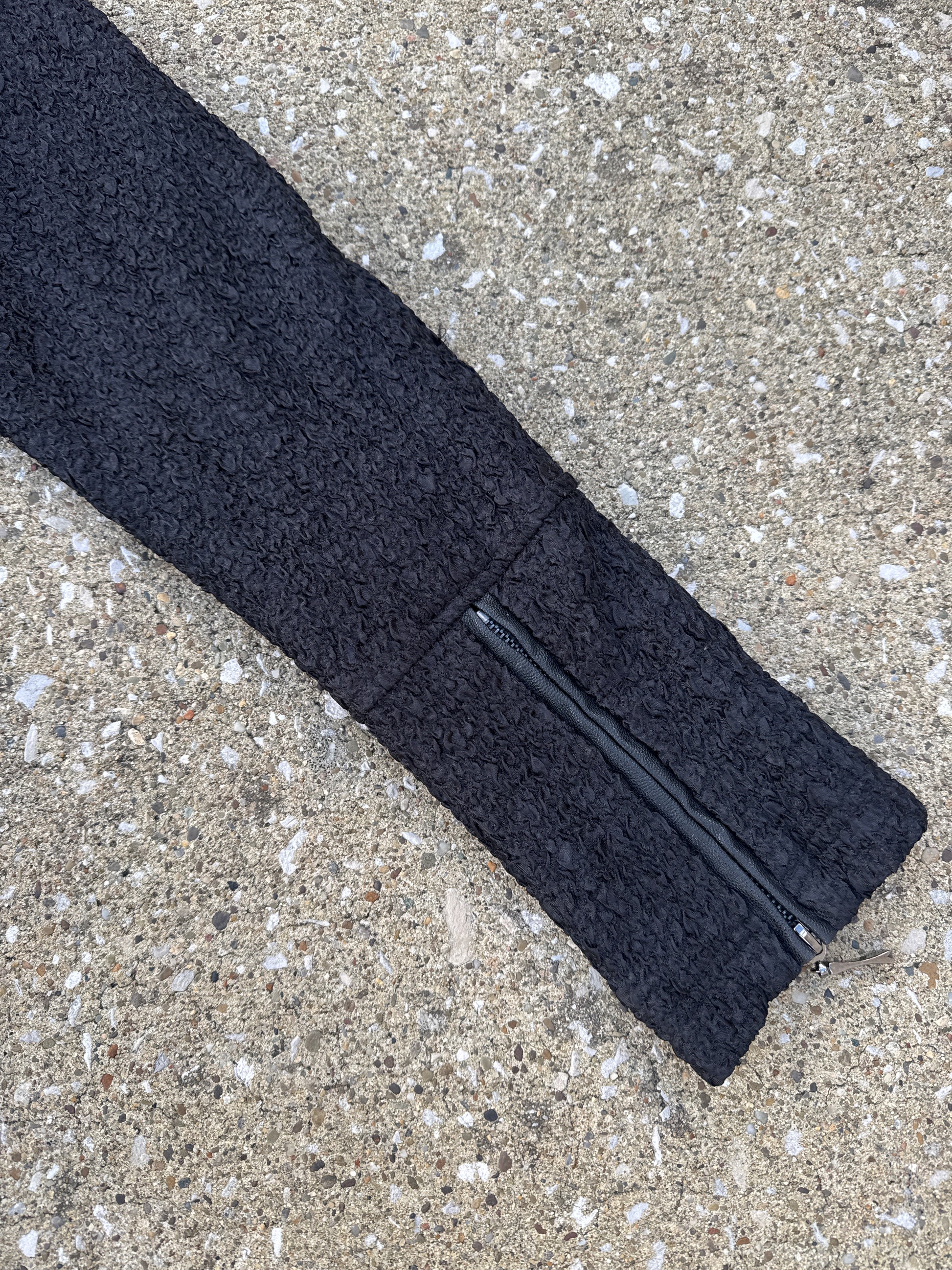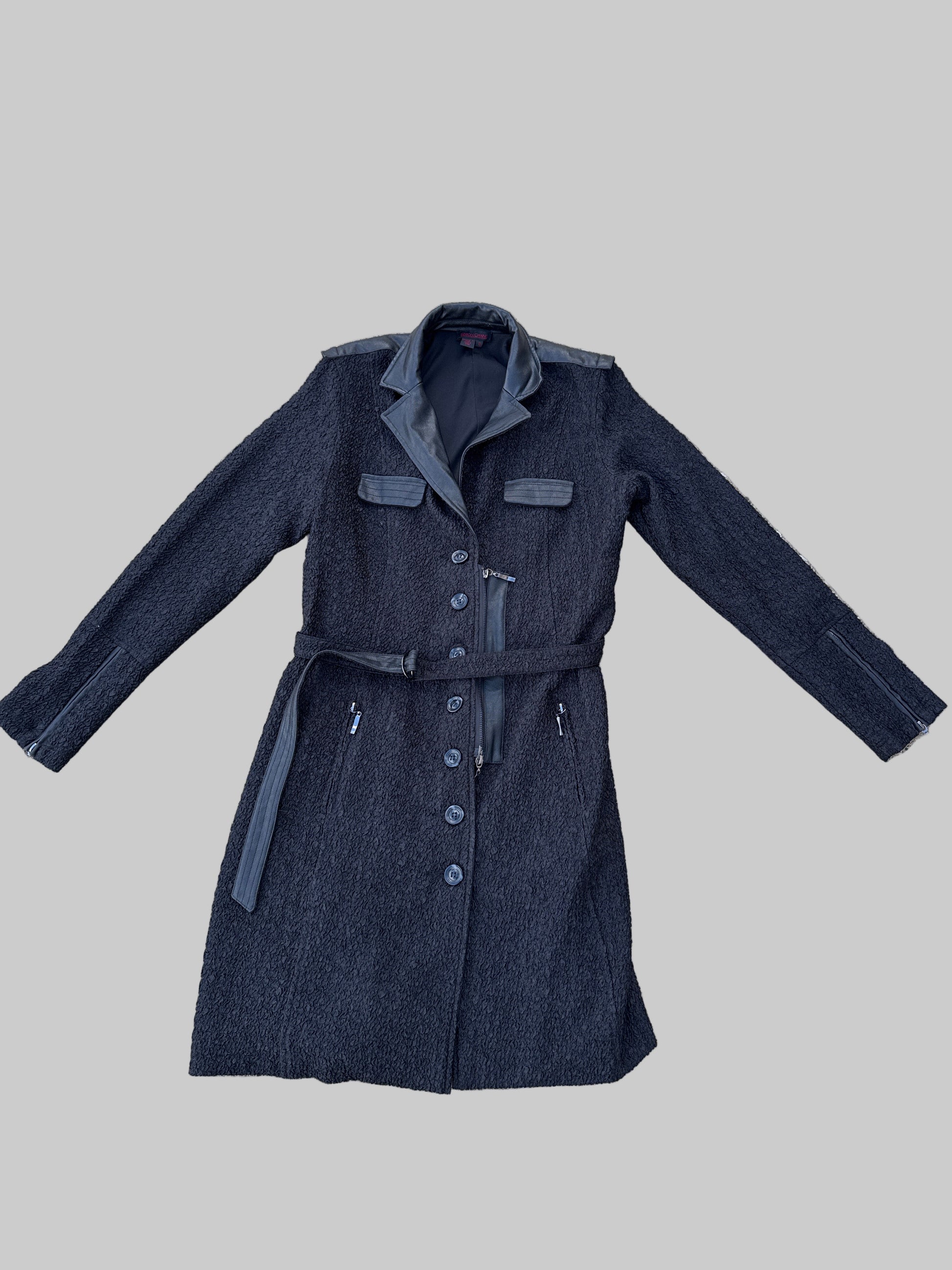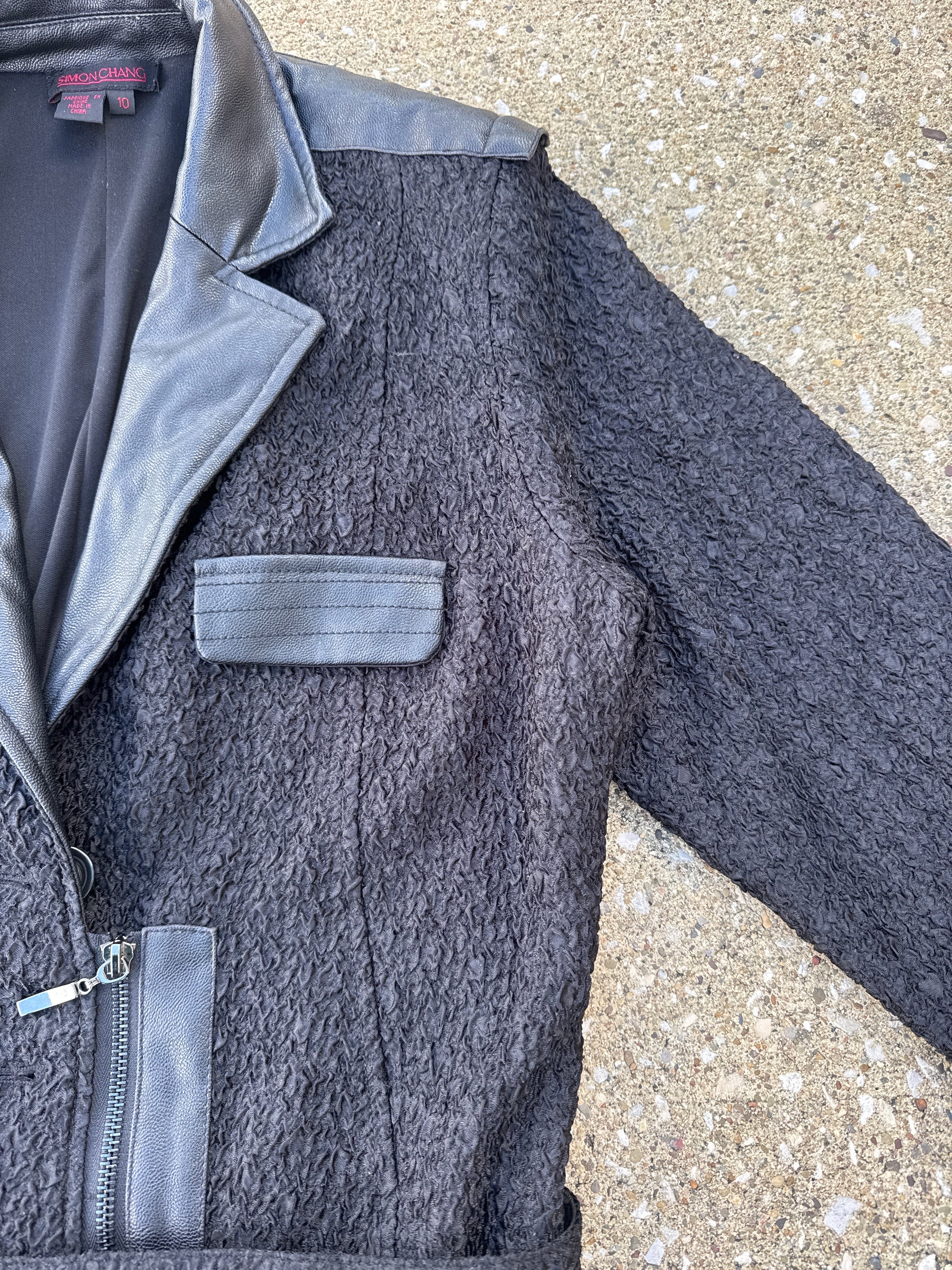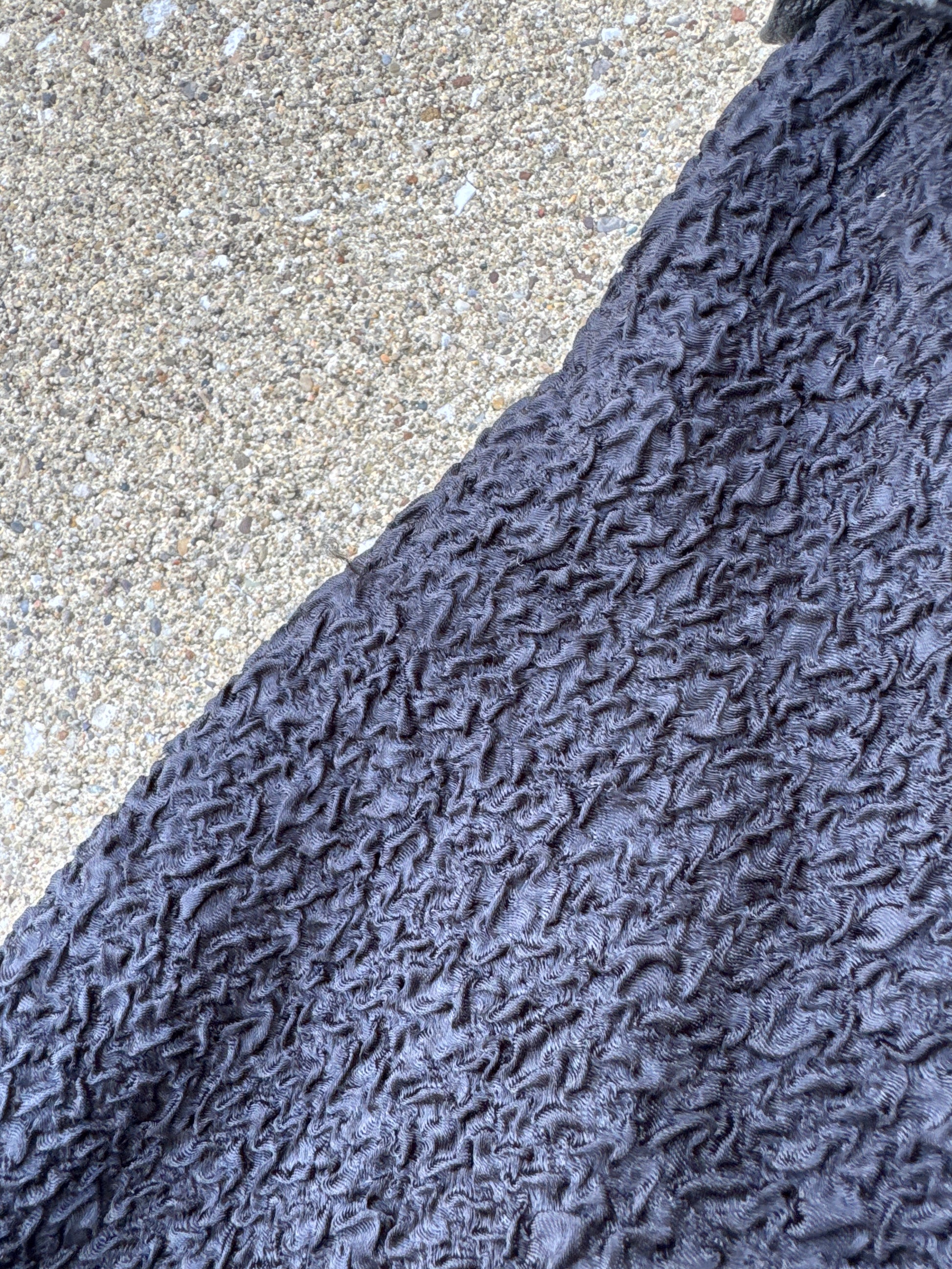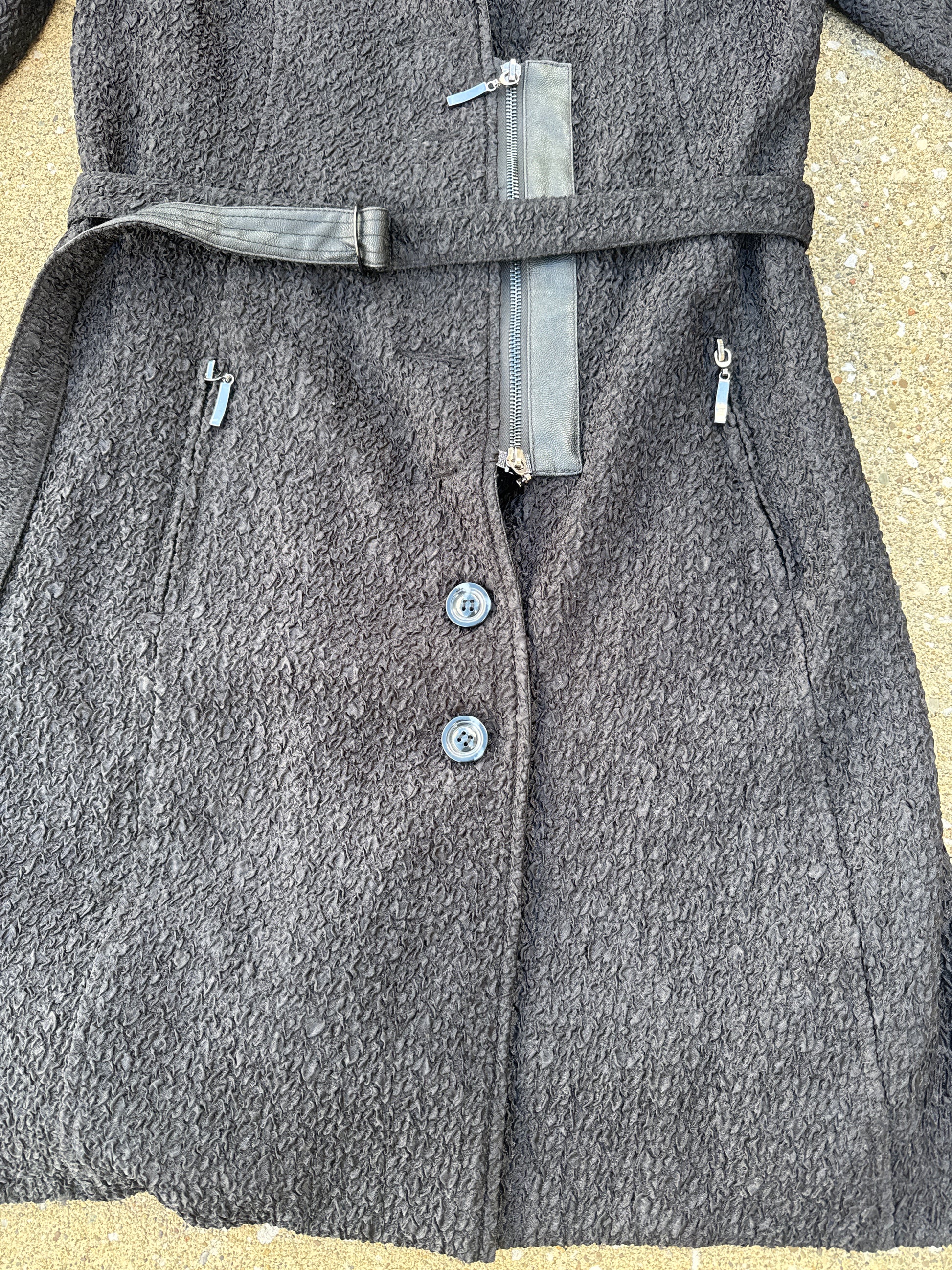 stretchy. A few small pulls in fabric. Two small tears on pleather part of belt.
